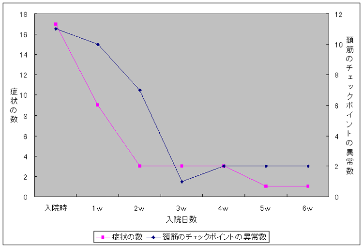 頚筋のチェックポイントの異常は2つとなり、症状は不眠のみであったが程度は軽くなった。まだ、完全に治療は終了していないが本人にどうしても退院しなければならない事情が出来て退院した。